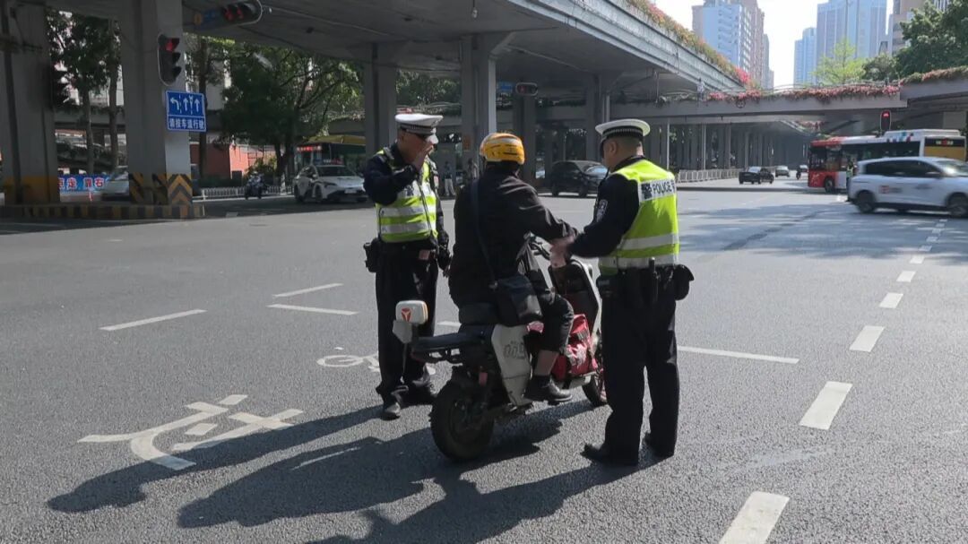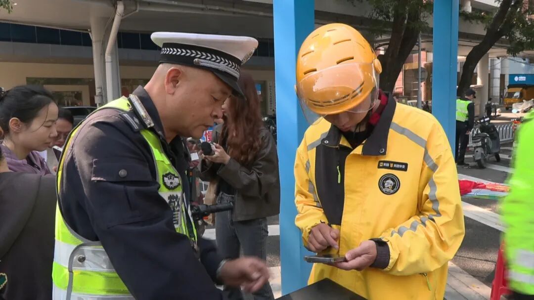 广州市公安局交通管理支队越秀大队 陈警官对不戴头盔、非法载人等轻微违法行为。我们联合各区在全市各个重点路口路段开展教育劝导,通过当事人拿旗子穿马甲的方式进行接力劝导。